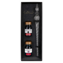 An elegant gift box, containing a glass pen and two fountain pen friendly inks. Herbin Perle noire and Poussière de lune both packaged in a wax sealed 10ml bottle. Great for any beginner or ink enthousiast.